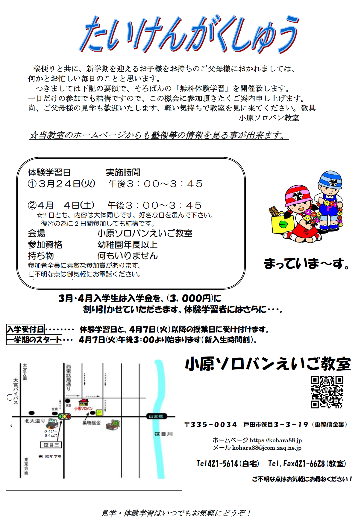 小原ソロバンえいご教室で一緒に楽しく学習しましょう! 戸田市笹目のそろばんの入学案内 小原ソロバンえいご教室 住所埼玉県戸田市笹目3-3-19 最寄北大通り「笹目3丁目」信号近く 巣鴨信用金庫の裏側 通学自転車通学可/駐車場なし 入学案内をみる 無料体験学習受付中!お気軽にお申し込みください。 体験学習お申し込み
