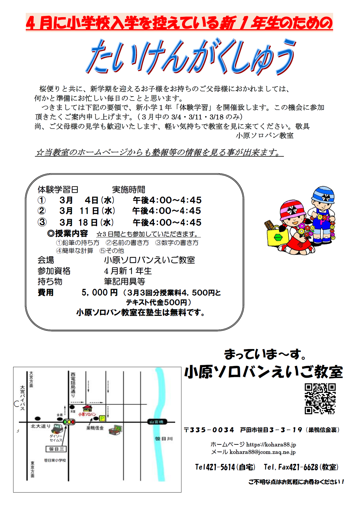 小原ソロバンえいご教室で一緒に楽しく学習しましょう! 戸田市笹目のそろばんの入学案内 小原ソロバンえいご教室 住所埼玉県戸田市笹目3-3-19 最寄北大通り「笹目3丁目」信号近く 巣鴨信用金庫の裏側 通学自転車通学可/駐車場なし 入学案内をみる 無料体験学習受付中!お気軽にお申し込みください。 体験学習お申し込み